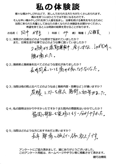 【慢性腰痛】長時間座っていると腰からお尻にかけて痛みが出て苦痛でしたが、数回の施術で痛みも出なくなりました!